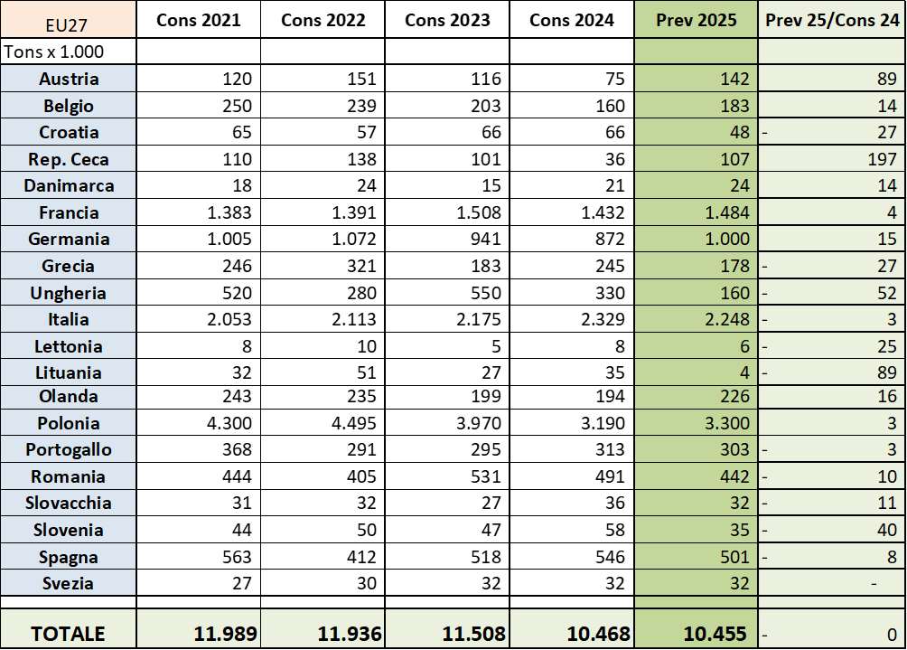 La previsione di produzione per l’Europa si mantiene in linea con il consuntivo dello scorso anno, pur evidenziando dinamiche diverse a livello nazionale. La Polonia registra una ripresa dopo la scarsa produzione del 2024, con una stima di 3.300.000 tonnellate (+3%). Incrementi significativi si osservano anche in Germania (+15%) e in Francia (+4%), così come in Repubblica Ceca e in Austria dove si tornerà a livelli normali, dopo l’ultimo anno di considerevole calo. Al contrario, a causa delle forti piogge primaverili, si prevedono cali produttivi in Spagna (-8%), Portogallo (-3%) e Grecia (-27%). In Scandinavia, la Danimarca mostra segnali di ripresa con un aumento del 14%, mentre in Svezia la produzione si mantiene stabile rispetto alla media degli anni precedenti.