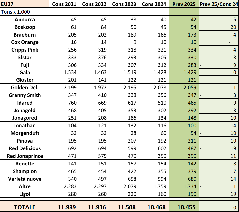 Le stime di produzione per il 2025 indicano un raccolto di mele in Europa che anche quest’anno sarà inferiore al potenziale storico di produzione, e che è stimato ad un totale di 10.455.000 tonnellate, un dato che quindi risulta sostanzialmente stabile rispetto allo scorso anno e inferiore del 7% rispetto alla media produttiva degli ultimi tre anni (Tab. 1).