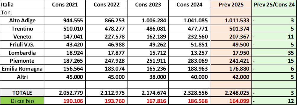 Per l’Italia, la produzione totale è stimata in 2.248.025 tonnellate, con un calo del 3% rispetto allo scorso anno (Tab. 3). A livello regionale, si registra un aumento della produzione in Trentino (+5%), mentre è previsto un leggero calo in Alto Adige (-3%) e nella maggior parte delle altre regioni. Particolarmente significativa la flessione attesa in Piemonte (-15%), che segue un’annata 2024 caratterizzata da rese elevate. In Veneto, la produzione dovrebbe diminuire dell’11% rispetto al 2024, anche a causa di danni provocati dalla grandine. Emilia-Romagna prevede un lieve calo rispetto al 2024 (-6%), così come il Friuli (-5%).