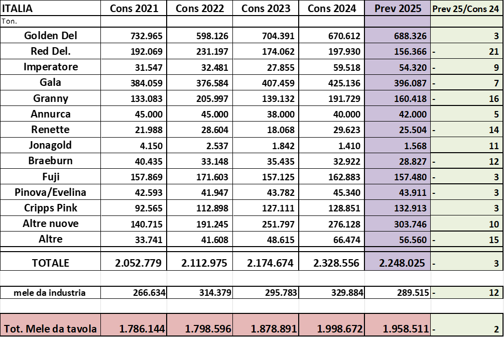 Si segnala una crescita della Golden Delicious del 3%, che raggiunge una produzione di 688.326 tonnellate, recuperando dopo i livelli particolarmente bassi registrati nel 2024, ma ancora al di sotto del potenziale storico. In aumento anche le varietà protette (club), mentre le varietà tradizionali mostrano un calo generalizzato. In particolare, la Red Delicious registra una flessione del 21%, attestandosi a 156.366 tonnellate: si tratta del livello più basso mai registrato per questa varietà. Sono previste riduzioni significative anche per la Gala (-7%) e per la Granny Smith (-16% rispetto al 2024). La Fuji perde terreno rispetto allo scorso anno (-3%), con una produzione stimata di 157.488 tonnellate.